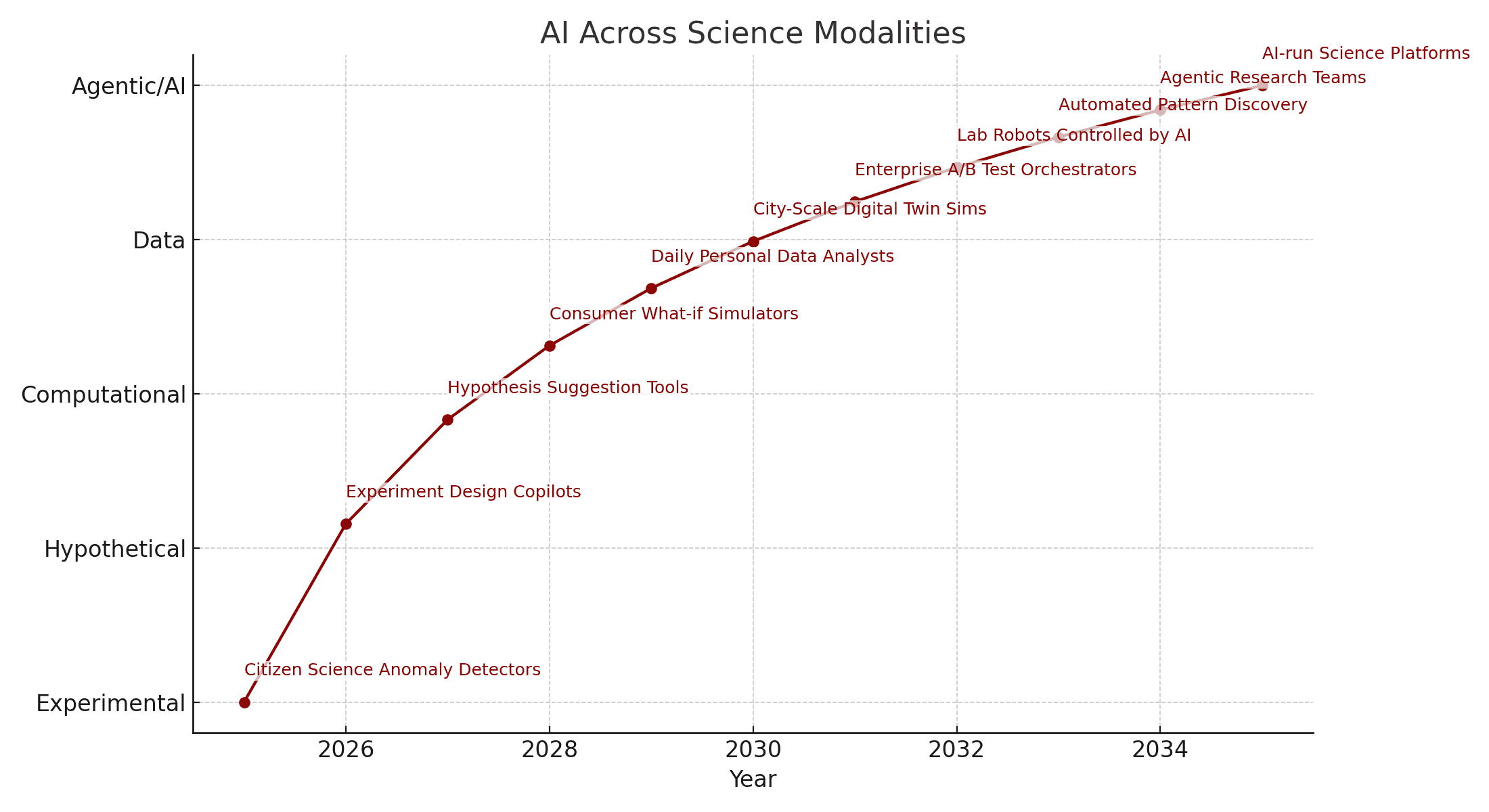 The “AI Across Science Modalities” chart captures this shift, again on a logarithmic curve. Early points include citizen science anomaly detectors and experiment design copilots, followed by consumer what-if simulators (“If I change diet, investments, routes, what happens?”) and daily personal data analysts. As we move into the future portion of the curve, we see city-scale digital twin simulations, enterprise A/B test orchestrators, lab robots controlled by AI, and finally agentic research teams and AI-run science platforms (always with human oversight).