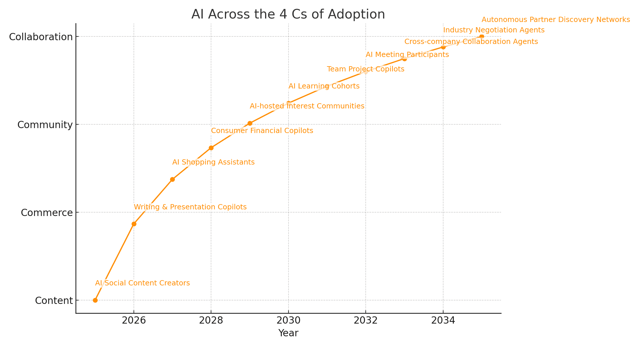 Beyond that, Community emerges when AI becomes part of who we learn and socialize with. The chart’s next points include AI-hosted interest communities and AI-facilitated learning cohorts, where AI tutors coordinate group progress, community moderation, or fandom experiences. Finally, we reach Collaboration, with team project copilots, AI meeting participants and summarizers, cross-company collaboration agents, industry negotiation agents, and autonomous partner-discovery networks.